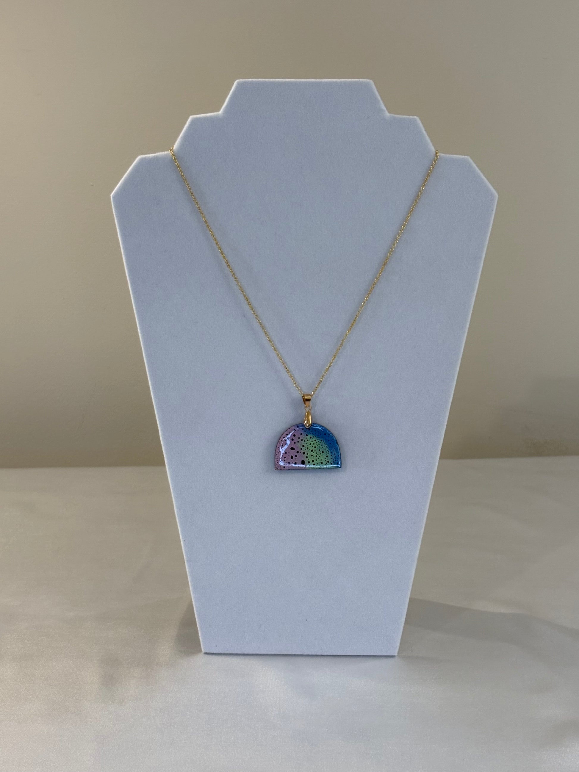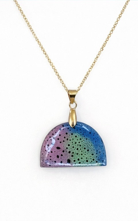 One of my favorite lines; this one was created in honor of our baby girl, Charma,a very sassy, but sweet Chameleon. Inspired by the iridescence and texture of reptile scales, each piece is individually poured, resulting in a one-of-a-kind pendant that shifts beautifully in light. Choose from 3 different shape options.